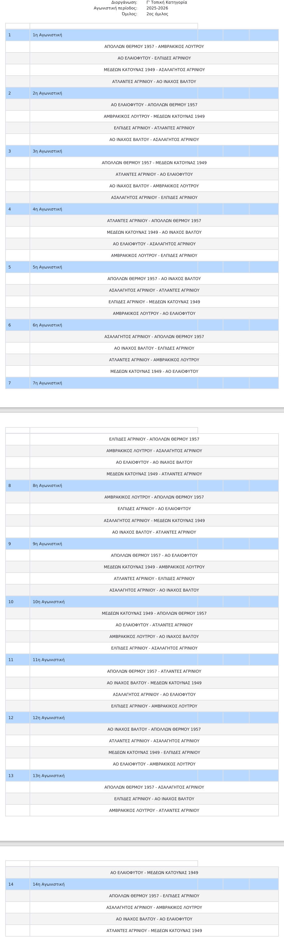 ΕΠΣΑ: Το πρόγραμμα της Γ΄κατηγοριας 2ος όμιλος 2025 - 2026 Κατηγορία: Γ ΚΑΤΗΓΟΡΙΑ Δημιουργήθηκε : Πέμπτη, 09 Οκτωβρίου 2025 10:42 Εκτύπωση Email Twitter ΕΠΣ ΑΙΤ/ΝΙΑΣ ΠΟΔΟΣΦΑΙΡΟ Γ΄ΚΑΤΗΓΟΡΙΑ
