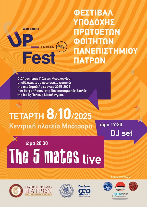 Ο Δήμος Ιερής Πόλης Μεσολογγίου, σε συνεργασία με το Πανεπιστήμιο Πατρών, υποδέχονται τους νέους φοιτητές της ακαδημαϊκής χρονιάς 2025-2026 που θα φοιτήσουν στις Πανεπιστημιακές Σχολές της πόλης, με το φεστιβάλ «Welcome to Up Fest»!