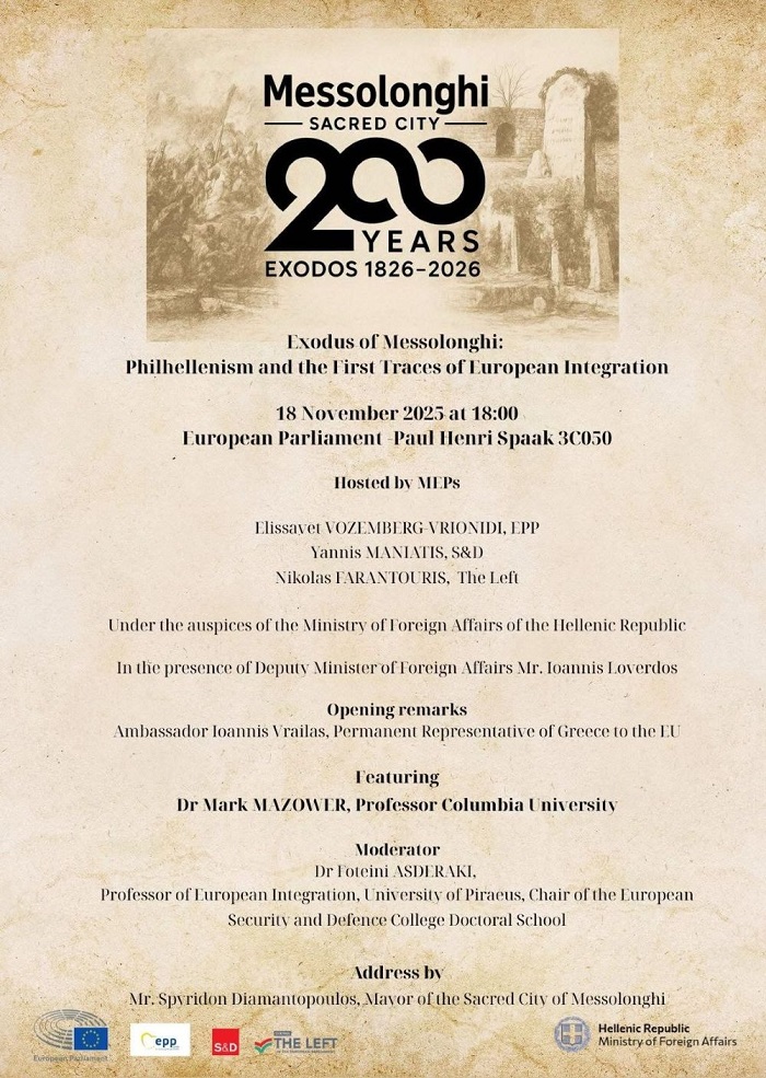Το Ευρωπαϊκό Κοινοβούλιο τιμά τη Διακοσιοστή Επέτειο της Εξόδου του Μεσολογγίου με την εκδήλωση «Η Έξοδος του Μεσολογγίου: Ο Φιλελληνισμός και τα Πρώτα Ίχνη της Ευρωπαϊκής Ενοποίησης», η οποία θα πραγματοποιηθεί στις Βρυξέλλες την προσεχή Τρίτη, 18 Νοεμβρίου 2025 στις 19:00 (ώρα Ελλάδας).