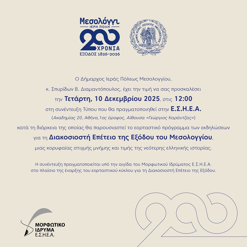 Ο Δήμαρχος Ιεράς Πόλεως Μεσολογγίου, κ. Σπυρίδων Β. Διαμαντόπουλος, έχει την τιμή να σας προσκαλέσει την Τετάρτη, 10 Δεκεμβρίου 2025, στις 12:00 στη Συνέντευξη Τύπου που θα πραγματοποιηθεί στην Ε.Σ.Η.Ε.Α. (Ακαδημίας 20, Αθήνα, 1ος όροφος, Αίθουσα «Γεώργιος Καράντζας») κατά τη διάρκεια της οποίας θα παρουσιαστεί το εορταστικό πρόγραμμα των εκδηλώσεων για τη Διακοσιοστή Επέτειο της Εξόδου του Μεσολογγίου, μιας κορυφαίας στιγμής μνήμης και τιμής της νεότερης ελληνικής ιστορίας.