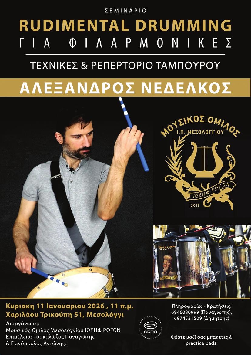 Την Κυριακή 11/1/2026 θα έχουμε την χαρά και τιμή να βρίσκεται στον Μεσολόγγι ως προσκεκλημένος της φιλαρμονικής του Μουσικού Ομίλου Ιεράς Πόλεως Μεσολογγίου ‘’Ιωσήφ Ρωγών” για ένα σεμινάριο στο Rudimental Drumming για Φιλαρμονικές ο drummer Αλέξανδρος Νεδέλκος!