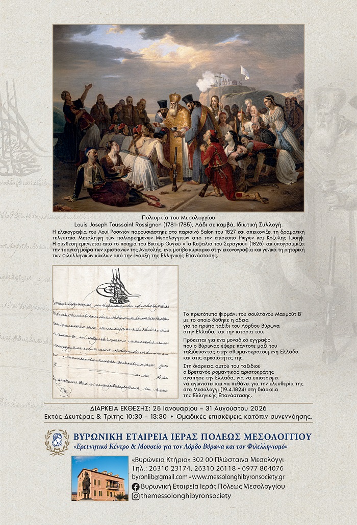Η Βυρωνική Εταιρεία Ιεράς Πόλεως Μεσολογγίου, με αίσθημα βαθύτατου χρέους και ευθύνης προς τη θυσία των Ελευθέρων Πολιορκημένων, διοργανώνει την πρώτη εκδήλωσή της για την Επέτειο των 200 χρόνων από την ηρωική τους ΕΞΟΔΟ.