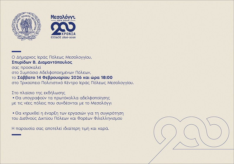 Στο πλαίσιο των επετειακών εκδηλώσεων για τα 200 χρόνια από την Έξοδο του Μεσολογγίου (1826–2026), ο Δήμος Ιεράς Πόλεως Μεσολογγίου διοργανώνει το Συμπόσιο Αδελφοποιημένων Πόλεων, το οποίο θα πραγματοποιηθεί το Σάββατο 14 Φεβρουαρίου 2026 και ώρα 18:00, στο Τρικούπειο Πολιτιστικό Κέντρο.