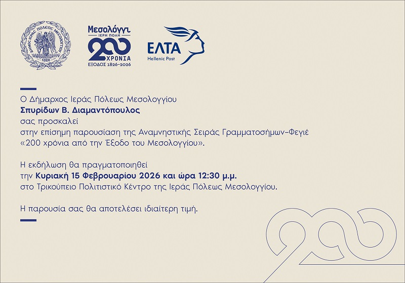 Η εκδήλωση πραγματοποιείται σε συνεργασία με τα Ελληνικά Ταχυδρομεία (ΕΛΤΑ) και πραγματοποιηθεί την Κυριακή 15 Φεβρουαρίου 2026 και ώρα 12:30 μ.μ., στο Τρικούπειο Πολιτιστικό Κέντρο της Ιεράς Πόλεως Μεσολογγίου.