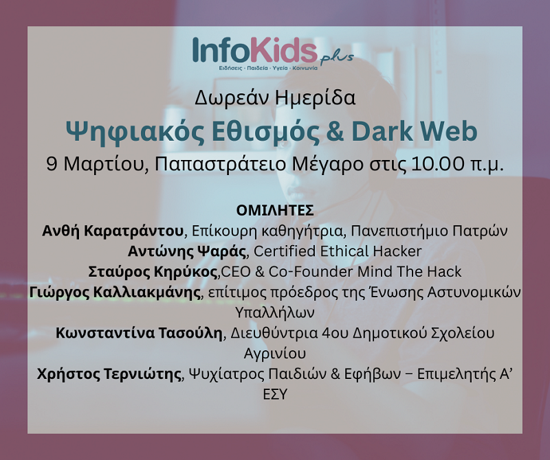 Το Infokids.gr, μεγαλύτερο ενημερωτικό σάιτ για γονείς, διοργανώνει σε συνεργασία με την Περιφέρεια Δυτικής Ελλάδας δωρεάν ημερίδα με τίτλο «Ψηφιακός εθισμός & Dark Web», με στόχο να ενημερώσει και να υποστηρίξει μαθητές, γονείς, εκπαιδευτικούς και φροντιστές σε θέματα που αφορούν την ψηφιακή ζωή των παιδιών.