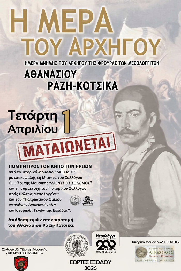 Ο Σύλλογος «Οι Φίλοι της Μουσικής Διονύσιος Σολωμός» και το Ιστορικό Μουσείο «Διέξοδος» ενημερώνουν το κοινό ότι η προγραμματισμένη εκδήλωση για την «Ημέρα του Αρχηγού», στο πλαίσιο των Εορτών Εξόδου, δεν θα πραγματοποιηθεί λόγω των προβλεπόμενων δυσμενών καιρικών συνθηκών.