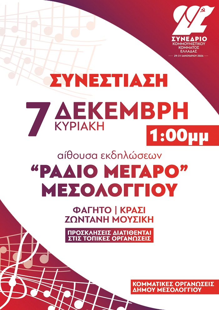 Οι Κ.Ο. Δήμου Μεσολογγίου του ΚΚΕ καλούν σε συνεστίαση! Κατηγορία: Επικαιρότητα Δημιουργήθηκε : Πέμπτη, 04 Δεκεμβρίου 2025 11:22 Εκτύπωση Email Twitter Ι.Π ΜΕΣΟΛΟΓΓΙΟΥ ΕΠΙΚΑΙΡΟΤΗΤΑ AITO NEWS ΚΚΕ