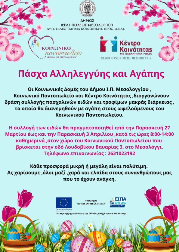 Ο Δήμος Ιεράς Πόλεως Μεσολογγίου, το Αυτοτελές Τμήμα Κοινωνικής Προστασίας και οι Κοινωνικές Δομές του (Κοινωνικό Παντοπωλείο και Κέντρο Κοινότητας με Παράρτημα Ρομά), διοργανώνουν τη δράση συλλογής πασχαλινών ειδών και τροφίμων μακράς διάρκειας με τίτλο «Πάσχα Αλληλεγγύης και Αγάπης».