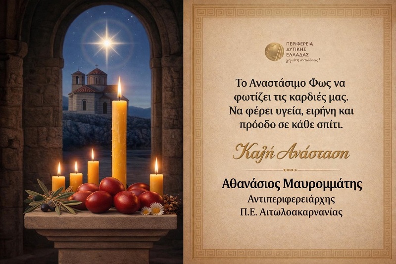 Ευχές από τον Αντιπεριφερειάρχη Θανάση Μαυρομμάτη Κατηγορία: Επικαιρότητα Δημιουργήθηκε : Σάββατο, 11 Απριλίου 2026 13:01 Εκτύπωση Email Twitter ΕΠΙΚΑΙΡΟΤΗΤΑ ΠΕΡΙΦΕΡΕΙΑ ΔΥΤΙΚΗΣ ΕΛΛΑΔΑΣ ΘΑΝΑΣΗΣ ΜΑΥΡΟΜΜΑΤΗΣ