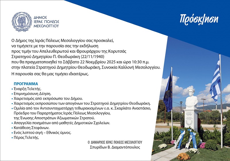 Ο Δήμος Ιερής Πόλης Μεσολογγίου σας προσκαλεί να τιμήσετε με την παρουσία σας την εκδήλωση προς τιμήν του Απελευθερωτή και Φρουράρχου της Κορυτσάς, Στρατηγού Δημητρίου Π. Θεοδωράκη (22/11/1940), που θα πραγματοποιηθεί το Σάββατο, 22 Νοεμβρίου 2025 και ώρα 10:30 π.μ. στην πλατεία Στρατηγού Δημητρίου Θεοδωράκη, Συνοικία Καλλονή Μεσολογγίου.