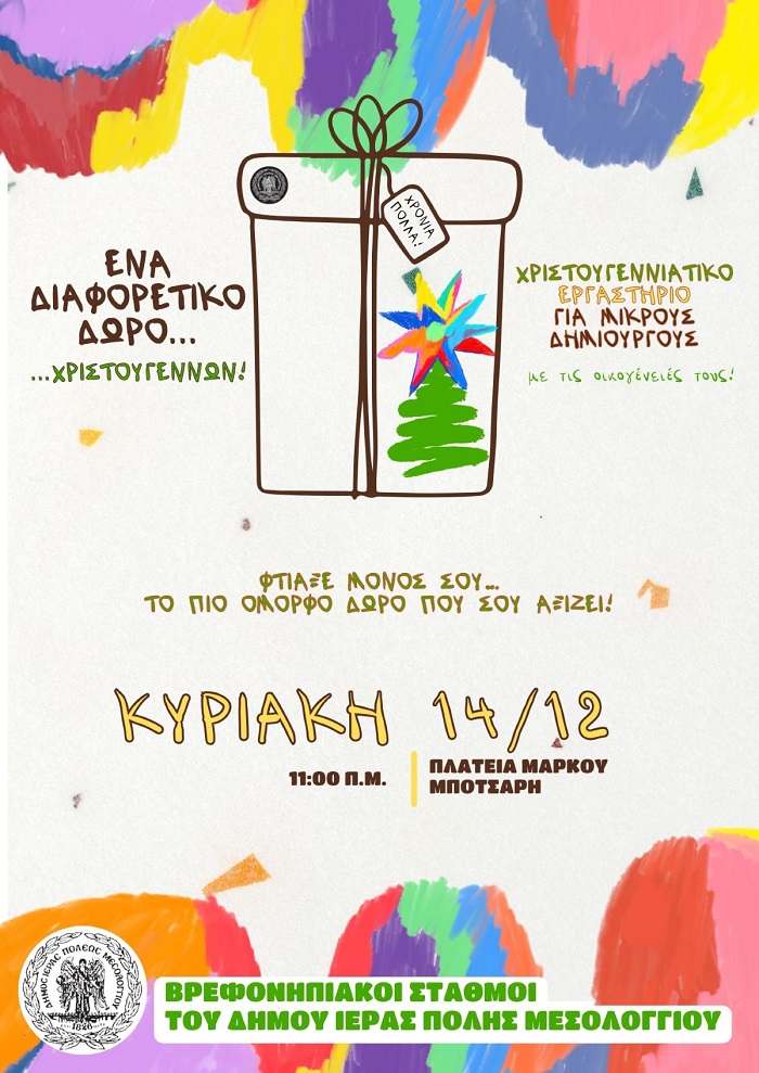 Οι Βρεφονηπιακοί Σταθμοί του Δήμου Ιεράς Πόλης Μεσολογγίου προσκαλούν όλα τα παιδιά και τις οικογένειές τους σε ένα χαρούμενο, δημιουργικό και... πολύχρωμο Χριστουγεννιάτικο Εργαστήριο!