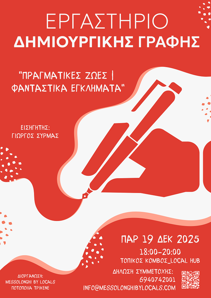 Το εργαστήριο διοργανώνεται από το Messolonghi by Locals και την Ποτοποιία Τρικενέ, στο πλαίσιο της παρουσίασης του βιβλίου του συγγραφέα Γιώργου Σύρμα με τίτλο REC (Εκδόσεις Ίκαρος).
