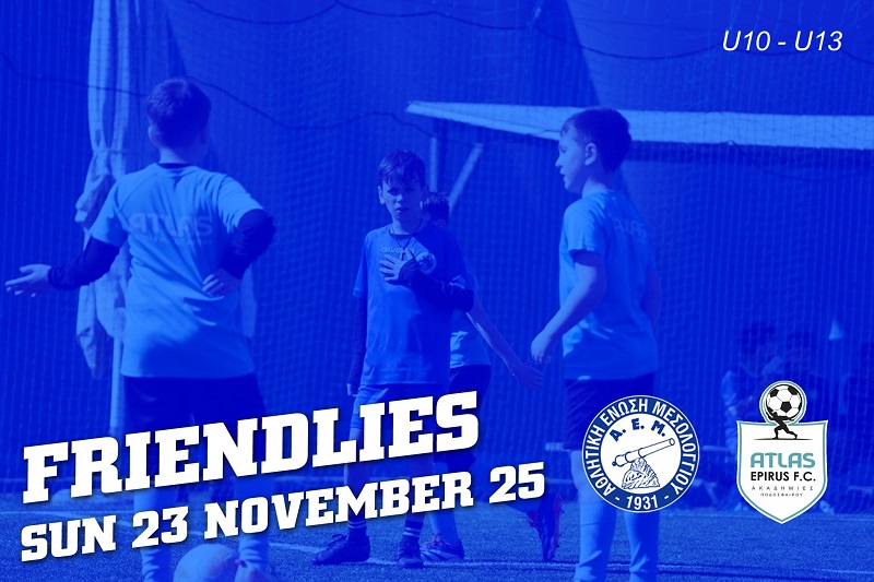 Την Κυριακή 23/11, οι ακαδημίες της Α.Ε. Μεσολογγίου θα φιλοξενήσουν στο Μεσολόγγι τις ακαδημίες του Atlas Epirus F.C., σε συνέχεια των περσινών φιλικών αναμετρήσεων που είχαν διεξαχθεί στην έδρα τους, στα Ιωάννινα.