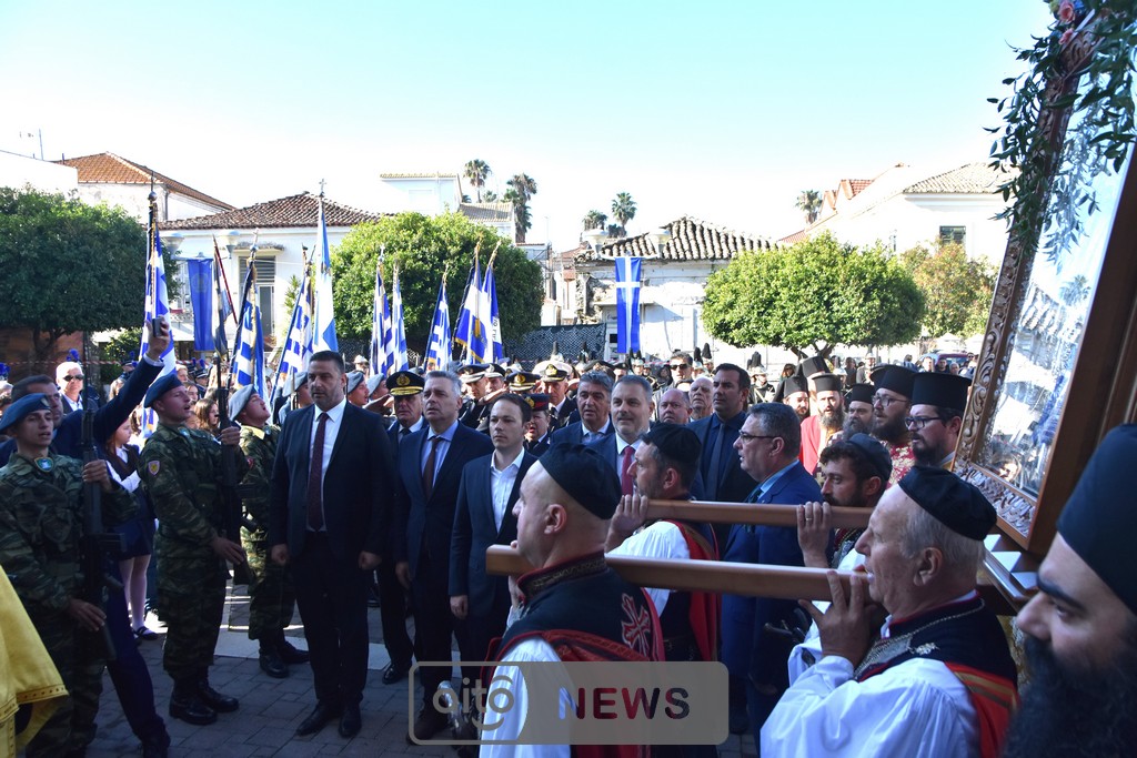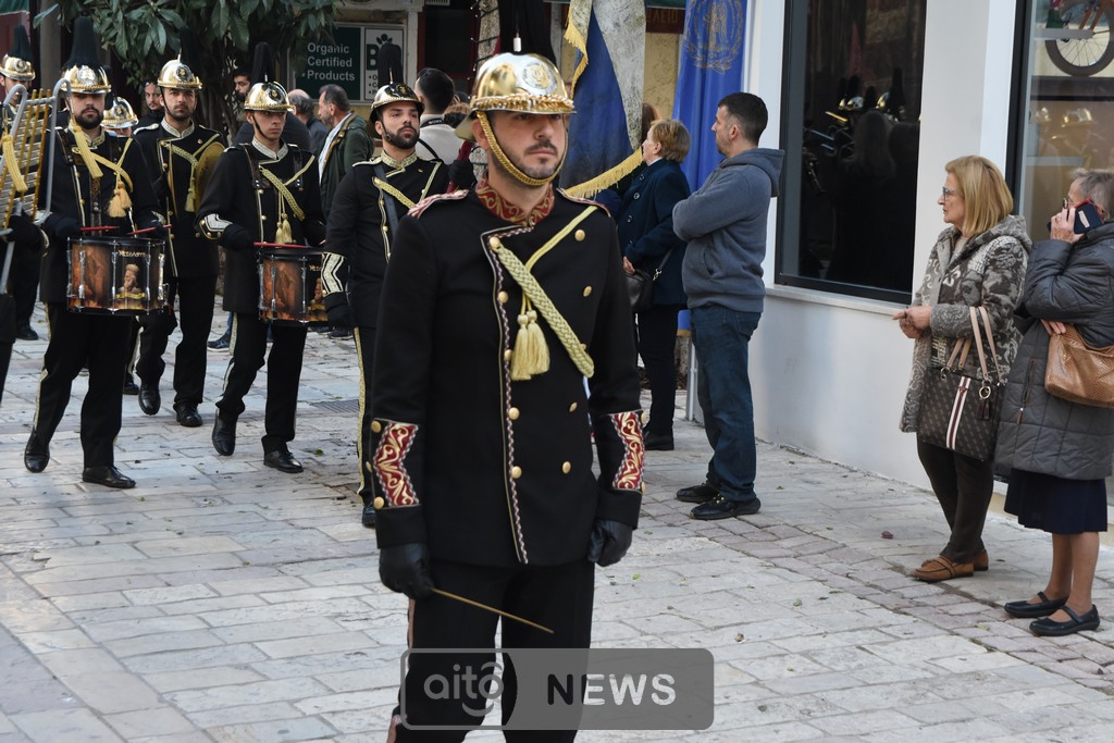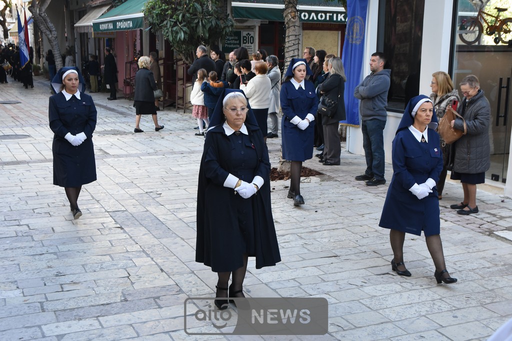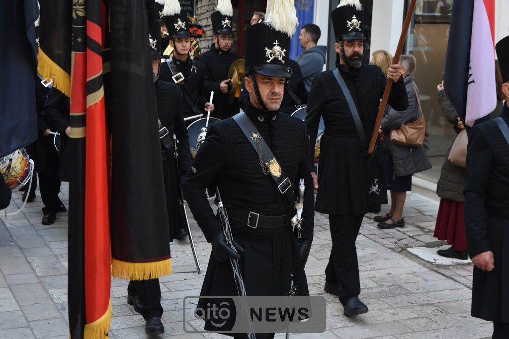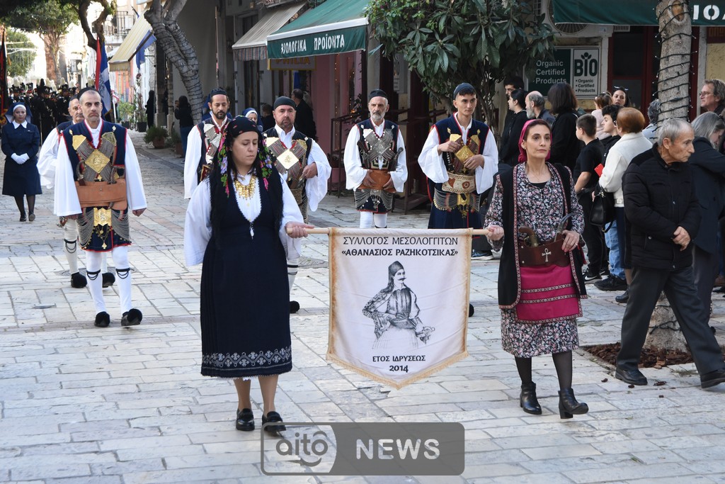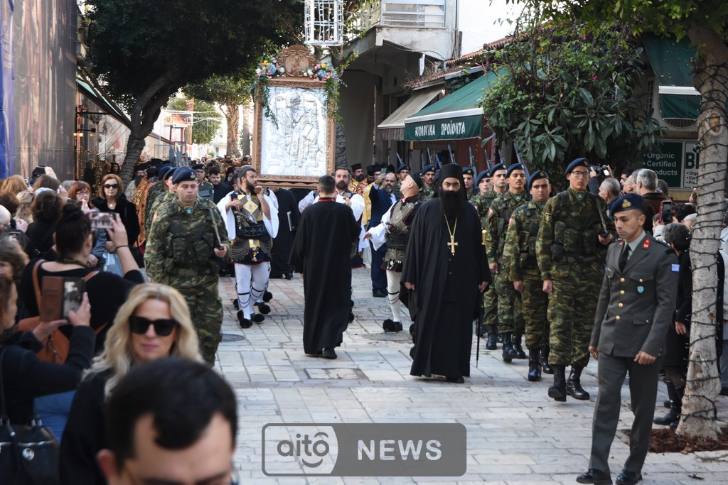 Ακολούθησε η καθιερωμένη λιτάνευση της ιερής εικόνας στους δρόμους της πόλης, με τη συμμετοχή και των τριών Φιλαρμονικών του Μεσολογγίου, στρατιωτικού αγήματος, εκπροσώπων συλλόγων και φορέων και σημαιοφόρων μαθητών από σχολεία της περιοχής. Η λιτανευτική πομπή κατέληξε στην κεντρική πλατεία, όπου τελέστηκε η καθιερωμένη αρτοκλασία υπέρ των Αρχών και του λαού.