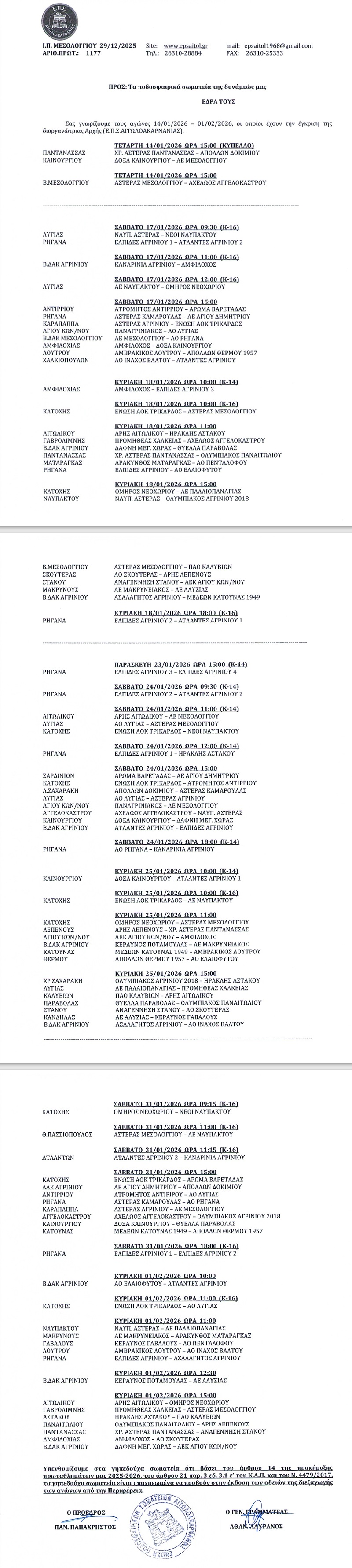 ΕΠΣ Αιτ/νιας: Ορισμός αγώνων Ιανουαρίου 2026 Κατηγορία: Slideshow Δημιουργήθηκε : Παρασκευή, 02 Ιανουαρίου 2026 09:57 Εκτύπωση Email Twitter ΕΠΣ ΑΙΤ/ΝΙΑΣ ΠΟΔΟΣΦΑΙΡΟ Α΄ΚΑΤΗΓΟΡΙΑ AITO SPORTS