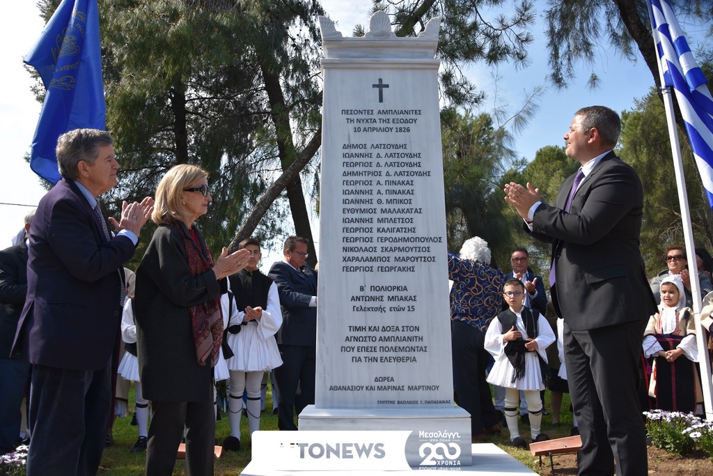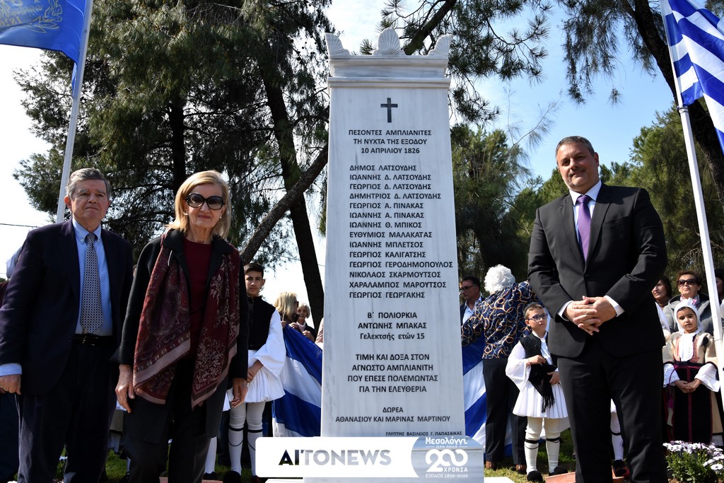 Με ιδιαίτερο συμβολισμό και έντονο ιστορικό φορτίο πραγματοποιήθηκε σήμερα, Κυριακή 8 Μαρτίου 2026, στον Κήπο των Ηρώων στην Ιερά Πόλη Μεσολογγίου η τελετή αποκαλυπτηρίων του Μνημείου των Πεσόντων Αμπλιανιτών, στο πλαίσιο των επετειακών εκδηλώσεων για τη διακοσιοστή επέτειο από την Έξοδο του Μεσολογγίου. Την εκδήλωση διοργάνωσε ο Δήμος Ιεράς Πόλεως Μεσολογγίου σε συνεργασία με την Επιτροπή Ανάδειξης της Ιστορίας της Άμπλιανης.