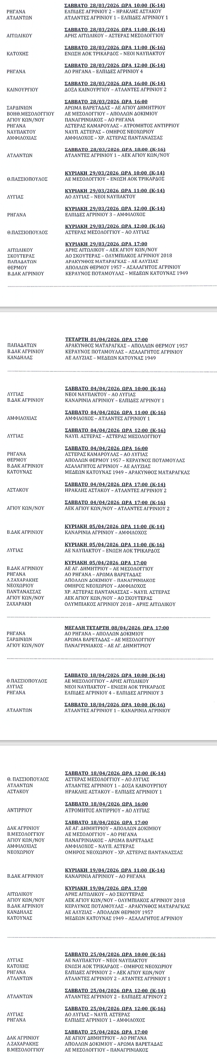 Ορισμός αγώνων 28/03-25/04/2026 Κατηγορία: Slideshow Δημιουργήθηκε : Τρίτη, 24 Μαρτίου 2026 17:03 Εκτύπωση Email Twitter ΕΠΣ ΑΙΤ/ΝΙΑΣ ΠΟΔΟΣΦΑΙΡΟ AITO SPORTS